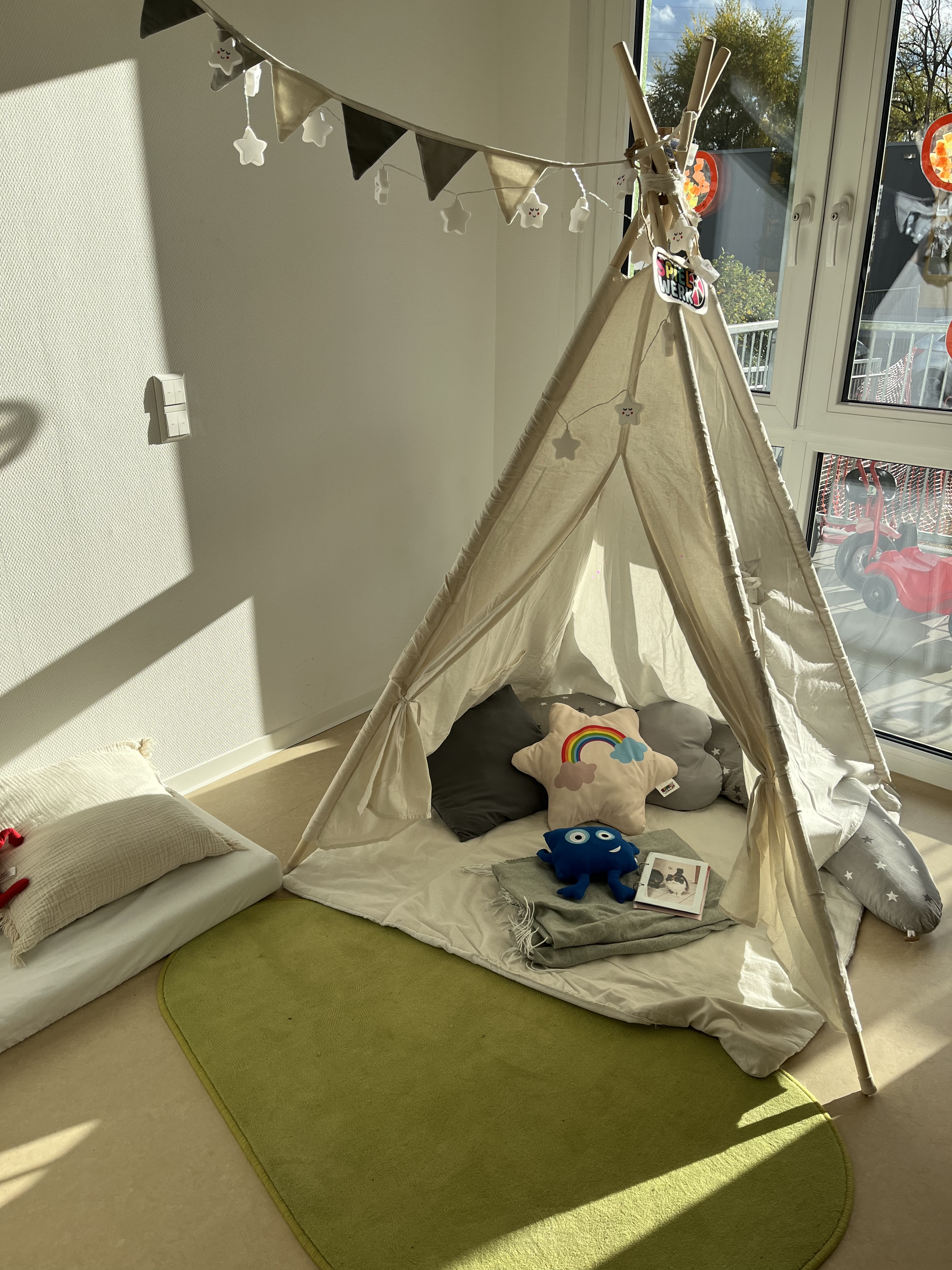 Die Betreuung der Kinder findet in verschiedenen Gruppen- und Funktionsräumen statt, welche dem Alter und den Interessen der Kinder entsprechend gestaltet sind. Durch das Arbeiten in teiloffenen Gruppen und mit dem Situationsansatz können Lern- und Interessensbereiche selbst ausgewählt werden und dem Interesse jedes einzelnen Kindes entsprechende Impulse und Angebote gestaltet werden.